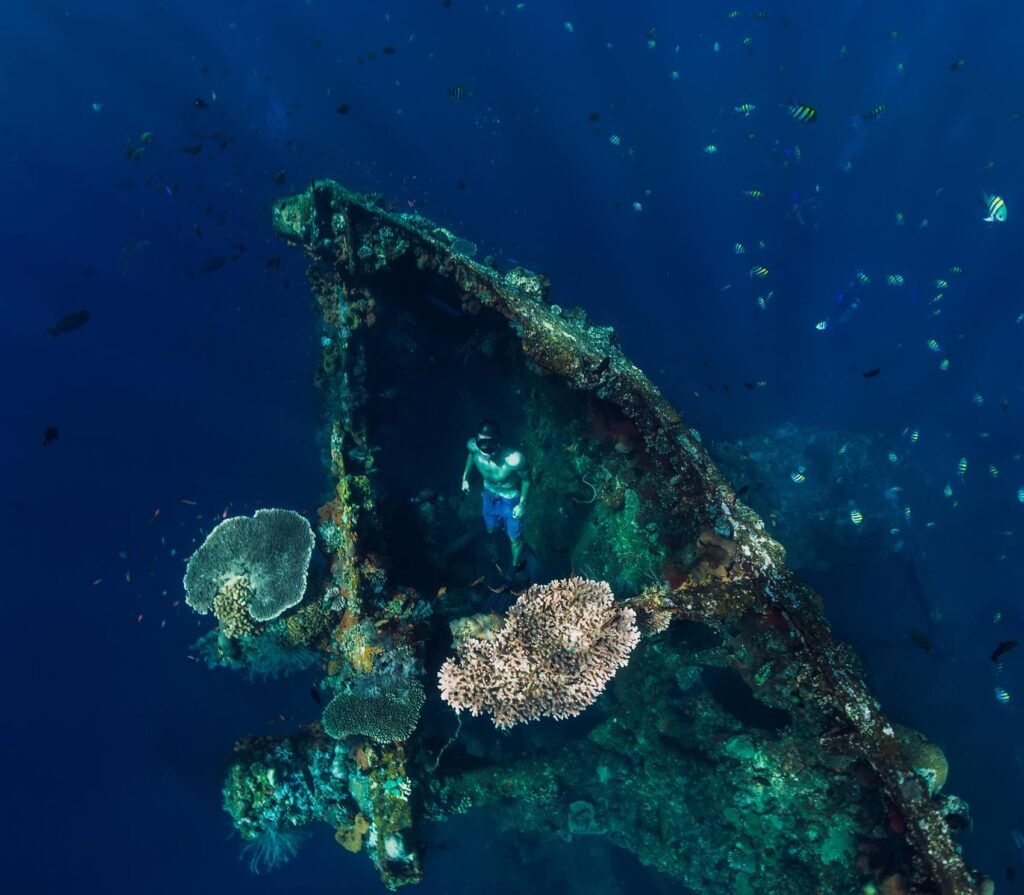 With a resting depth of 30 to 40 meters, the Boga Wreck is a favorite among experienced divers looking for bioluminescent night dives and wreck penetration. Sponge-covered and teeming with fish, it competes with Liberty for underwater photography. Smooth transfers between Kubu and Tulamben sites, naval briefings, and UV twilight dives are all provided by local guides. Boga is perfect for honing skills and discovering Tulamben’s rich diving heritage because to its excellent visibility and difficult depth.