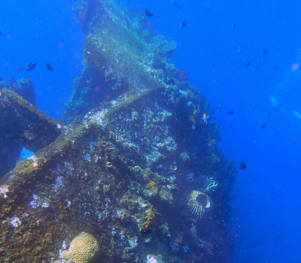 This WWII ship is known as the USS Liberty Wreck. It’s a 120m-long artificial reef at 3-29m depths. You’ll see Napoleon wrasse and pygmy seahorses here.
